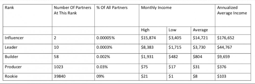 As you can see there are different ranks, Rocky, producer, builder, leader, and influencer. While those at the top are making good money, the amount of these people is so if you it is ridiculous. You can see that there are 39,840 people at the rank of “Rookie” that made in average annual income of $103, and there are only 2 people with the rank of “Influencer” that made an average annual income of $176,652. The overwhelming majority of people are earning close to nothing.